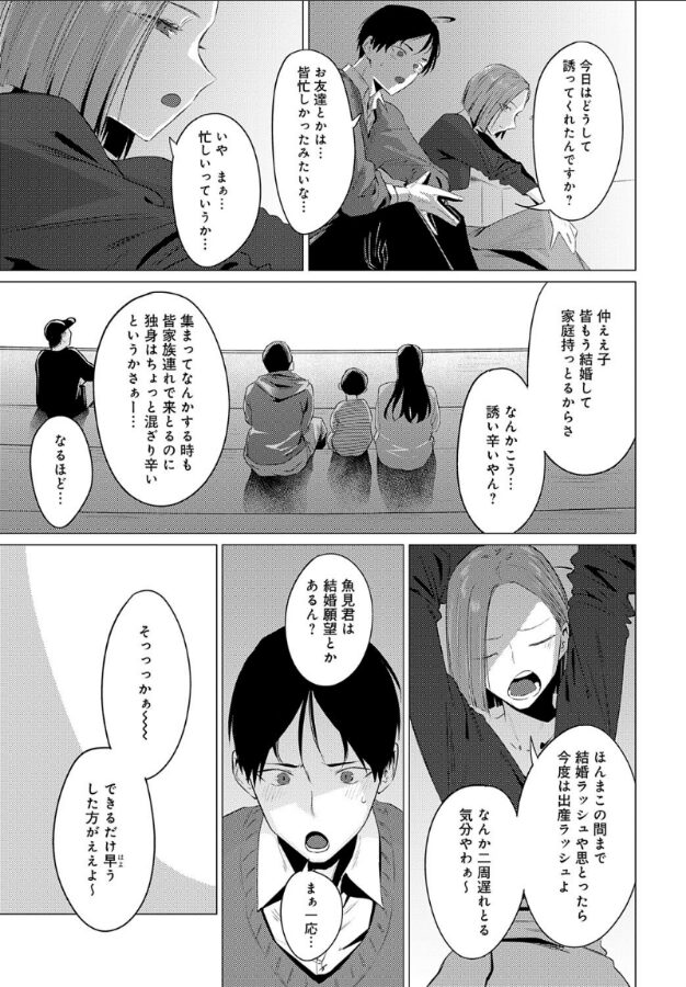 水族館という爽やかなデートシーンで、なぜ自分が誘われたのかと戸惑う主人公に対し、「周りの友人はみんな家庭持ちだから」という理由を明かす池中さん。そこに滲む寂しさや結婚への焦りがリアルで、一気に彼女の人間味が増します。