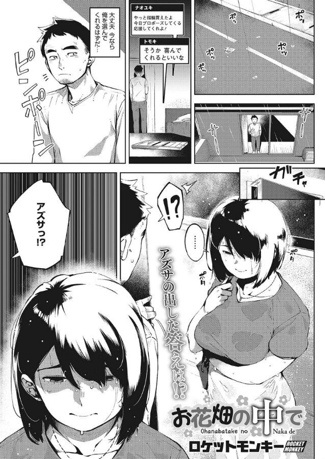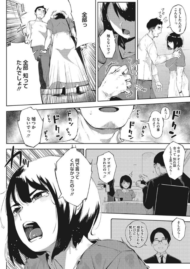 アズサと付き合っているナオユキは、共通の友人だったトモキにアズサを寝取られてしまっていた。何度も浮気セックスを繰り返しトモキのチ●ポなしではいられなくなったアズサは、ナオユキと別れ話をしようとしていた矢先に、ナオユキから結婚しないかとプロポーズされてしまう。困惑したアズサはその場から立ち去り、トモキに会いにいく。