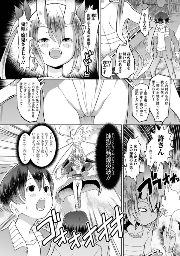遺産で受け継いだ古民家に住まわっていた鬼姫。なにやら付近の伝承などとも関わりあるようで、由緒正しく豆にも弱い?古の契りの為、Hすることに。鬼娘はやはり豆が弱く、股間の豆を舐められるとなよなよでぶしゃーっと放尿。すっかりしおらしくなってしまった鬼姫、縛ってまぐわいに!※この作品は「ロリババア専門アンソロジー 千代娘 巻の七」に収録された作品の単話配信です。