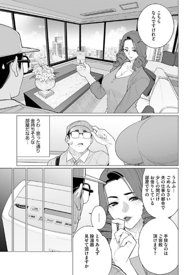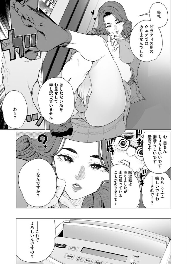 作業員が除湿器のメンテナンスに呼ばれて行った先は、タワマンの一室(美熟女な奥様付)。ピラティスが趣味の奥様は運動時の湿気が気になる様子。ご依頼の除湿器も無事問題解決したものの、そういうことであれば、動作チェックもした方がよいでしょうね。おや、ここに奥様の湿った秘部が。