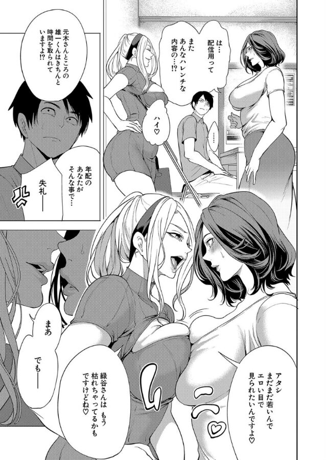 大学生の雄一は、SNSエロアカウントで嘘のヤリチンアピールをしている童貞だった。しかし彼の住むマンションの人妻達には「ヤリチンエアプの童貞」だとバレているらしく、欲求不満でエロい人妻に次々と襲われてしまう。しかしマンションの敷地内でギャル系人妻・黄野さんとセックスしているところをマンションの管理人の奥さん・緑谷さんに目撃されてしまっていて……!?