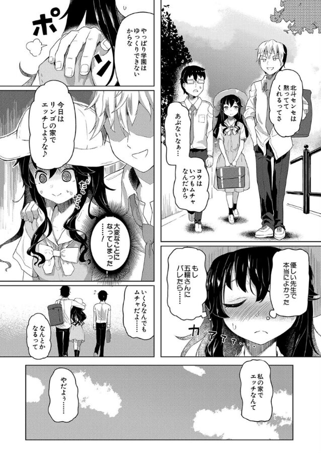 結婚の年齢制限が撤廃された世界。男性教師と結婚した女子生徒のリンゴだったが、彼女は先輩の男子と一線を越えてしまった。またセックスしようと誘う先輩だったが、男性教師の北斗のお陰でセックスは未遂に住んだ。しかし北斗にそれをネタにゆすられてしまったリンゴは、今度は彼とセックスすることになり……!
