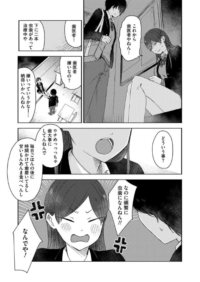 歯みがき大作戦◆なんだか憂いを帯びた表情で教室の片隅に座り込んでいるヒロインの品田さん。「これから歯医者やねん…」どうやら虫歯が2本あるらしく治療に行かなければならないとのこと。「ウチめっっっちゃ歯大事にしてんねんでなのに虫歯になんねん!なんでや!」一方で虫歯になったことがないという片野君。そこで「ハミガキの仕方に秘訣がある?」と考えた品田さん。「ウチの歯 磨いてくれへん?」口内をぐちゅぐちゅに掻きまわしますっダメだとわかりつつも片野君の口内いじりが止まらない…!おたき先生の最新作!今回も「最強」の「キュン」を届けに参上!