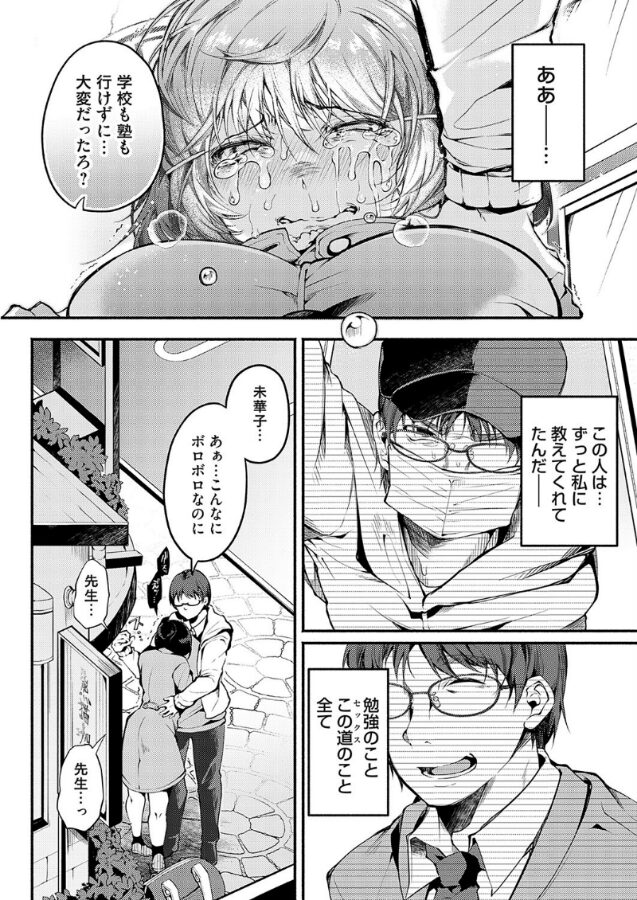 肉感JK描く、よしみずの新境地!分からないことは勉強しよ?ハードフル性教育最終講義!!目標の大学を目指し黒峰未華子(くろね・みかこ)は今日も塾へと通う。講師の兎沢(うさわ)にいつも自習用プリントを作ってもらうほど人一倍熱心。いつも応援してくれる兎沢に密かな恋心を抱く。しかし塾の帰り道、男にトイレへ連れ込まれそのまま処女喪失。レ●プ犯はなんとあの兎沢だった。同級生やホームレス、裏垢で繋がった会社員との未華子の淫らな行為が学校と親バレ。退学と勘当でボロボロの未華子がすがった1通のDM。そして待ち合わせた先にいたのは――ずっと待ち望んでいた兎沢。そして始まる先生宅での抜き打ちテスト。ボテ腹浣腸フェラで兎沢チンポの形と匂いを総復習。卑猥な下着にアナルプラグを差し込み生挿入。ここからが授業の本番――先生と生徒、腰を打ちつけ本能むき出しSEX開講!!