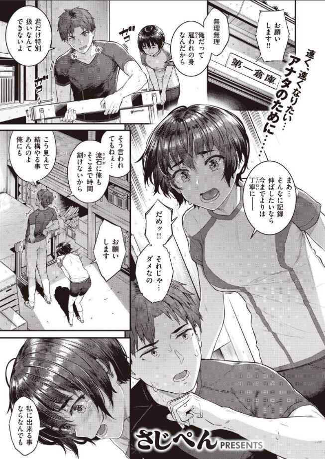 「私に出来る事ならなんでも。なんでも……しますからッ」憧れの先輩と同じ学校へ進学したいから……コーチにカラダを捧げます!!陸上女子がスポーツ推薦を勝ち取るため、表と裏ふたつの指導を受けることに。スポユニ姿で、制服姿で……時には涙を流しつつもハードなメニューをこなしていく。
