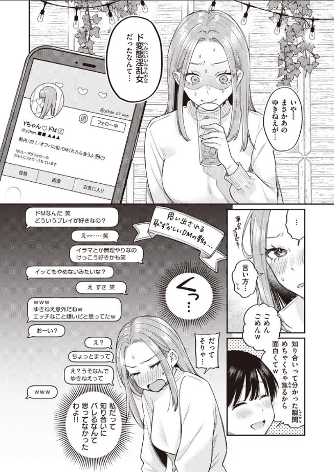裏垢に自分の写真や性癖を公開するようなアカウントにマッチした男性に会うことになります。待ち合わせにに現れたのは成長した8歳年下の幼馴染ヒー君でした。