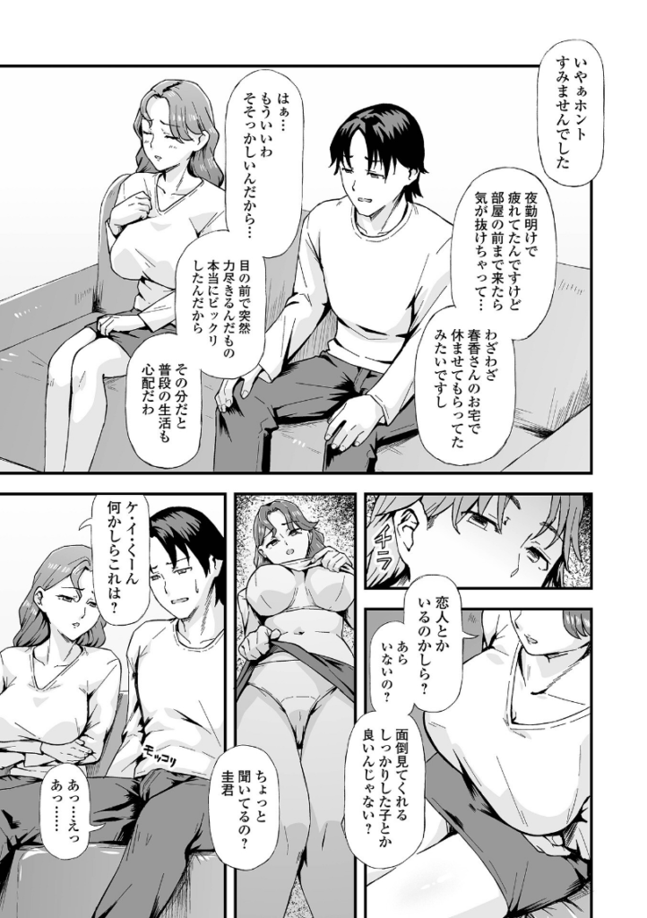 その姿に彼の股間が反応し、それを見逃さなかった奥さんは自室に彼を引っ張り込む。大きくして辛いなら私が抜いてあげると、彼の逸物を握りしめ…!