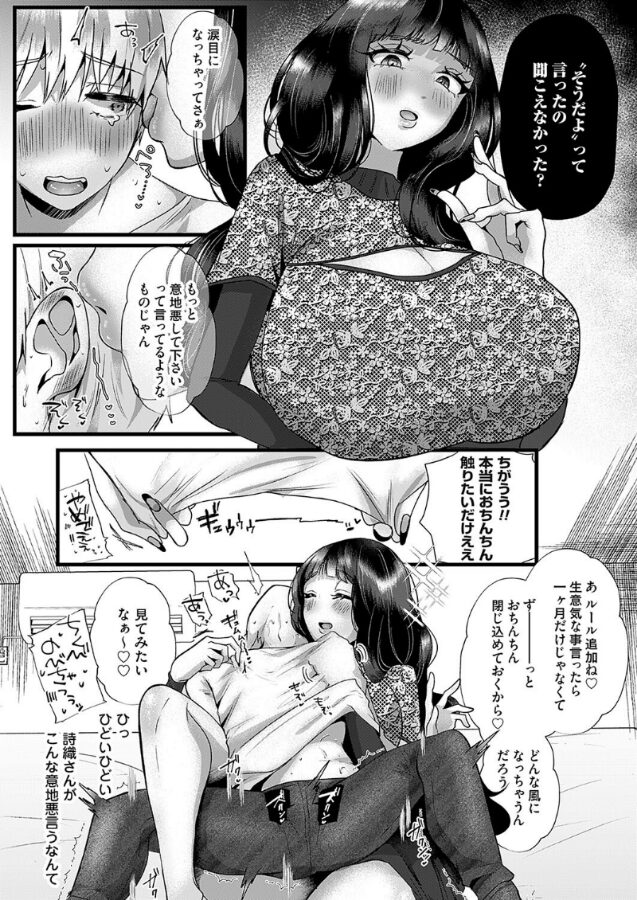 生挿入一切なし!一ヶ月の射精管理で、性欲オバケの生意気彼氏にいじわるしちゃう!!「暁(あき)くん、いい加減にして」同棲してから毎日Hを求める暁はついに詩織(しおり)から咎められる。これ以上は付き合いきれない。詩織は我慢が利かない暁のわがままペニスに貞操帯をつける。詩織の大事な仕事が終わるまでの一ヶ月間、Hと射精禁止のお達しを告げられてしまう。翌日、案の定仕事も全く手につかない暁は貞操帯を外してもらうべく画作する。好物で買収しようとするが、詩織には全部お見通し。射精できず敏感になった暁の乳首を服の上からカリカリスリスリじ〜っくり意地悪。爆乳おっぱいも押し付けられ耳元囁きの超密着生き地獄で弄ばれる。そして一週間、詩織のいじわるは止まらない。身体のラインが引き立つ服を着てHな下着まで見せつけてくる毎日。「私ちょっとシたい気分かも…」我慢の限界!その矢先、詩織からのお誘いが!!久しぶりのキスで沸き立つテンションでいざ!!!…ペニバンをつけられました。もちろん貞操帯はついたまま…詩織の肉厚な唇とお口がペニバンに絡みつき、指で前立腺を責められる。それでも射精も彼氏チンポも使うことは許されない。詩織がイクまで終わらないオナニーを目の前で繰り広げられ夜は更けていく…。海野りょう初の前後編、二号連続で詩織さんのいじわるを味わえちゃう!