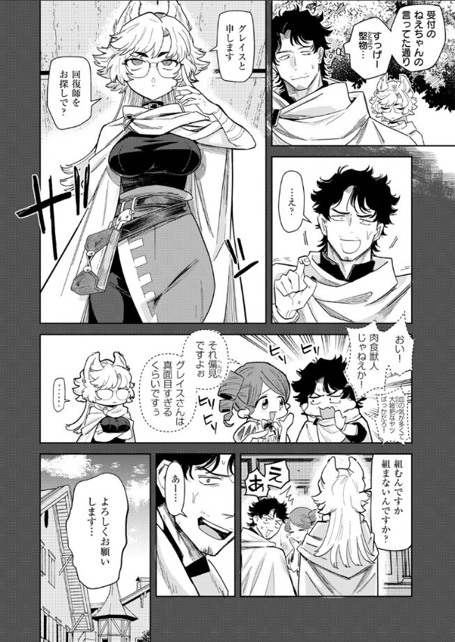 前半は勇者と獣人のコンビによる王道のファンタジー的な展開を見せ、途中からエロ要素がてんこ盛りになっていくのが良かったです。 獣人であるグレイスは真面目な性格をしているのに、薬の効果で性欲が何倍にも増してしまう様子にギャップ萌えを感じました。獣耳がついていて、なおかつメガネっ子というビジュアルも個性的で素晴らしかったです。 主人公もグレイスの誘惑に耐えきれなくなり、物語が進むごとにお互いの理性が崩壊していく展開には興奮が止まりませんでした。真面目な人が性欲に溺れてしまう展開が好きな人は、ぜひこの作品を読むべきだと思います。 |