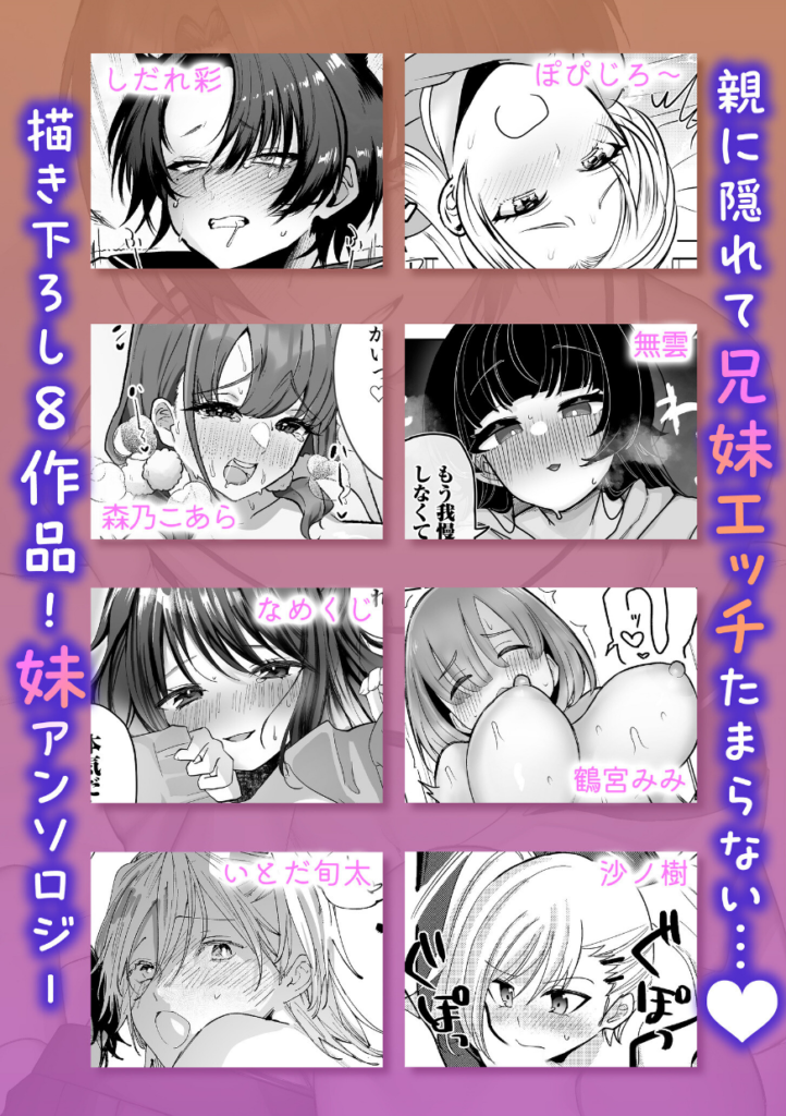 「兄ちゃんだってあたしに興奮してんじゃん…変態」妹の馨(かおる)とは性格が正反対だけど、ある共通点があった。それは性に対して貪欲なことだ。気まぐれで妹に手を出したのがきっかけだったが、それがハマってしまったらしい。兄妹という関係だからいけないことだと分かっているけど、敏感な乳首を弄ると何回もイッてしまってしだれ彩・ぽぴじろ〜・森乃こあら・無雲・なめくじ・鶴宮みみ・いとだ旬太・沙ノ樹人気作家8名がお送りする、アシオナcomic妹アンソロジー!