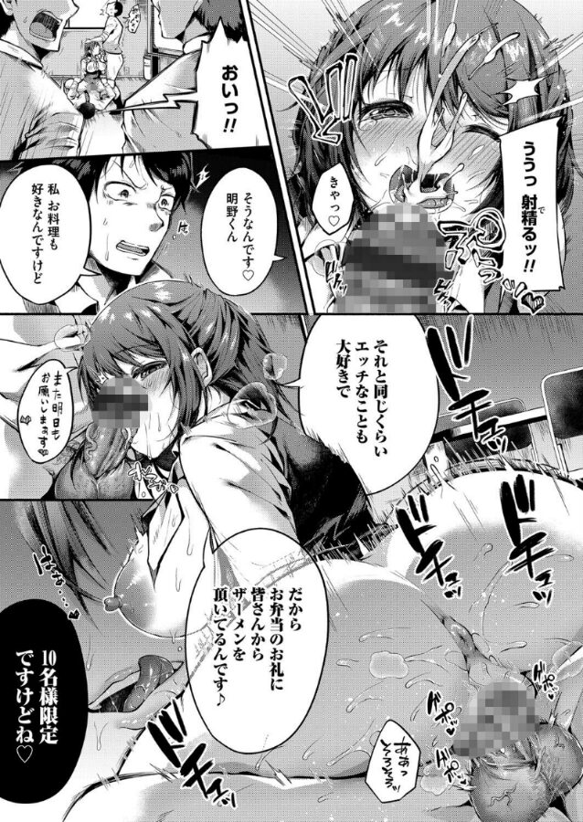 堂島の誘いで弁当箱を返すついでに明野は一緒に会議室へ。そして、そこで目にしたものそれは…騎乗位で巨乳を揺らし、上も下も嬉しそうにペニスを頬張る雛内の姿だった!!『一食一射精』実は彼女、対価として男性社員10人のザーメンを搾り取る、セックス大好きOL!堂島含め、感謝の射精を受け止める雛内。好きな女が目の前で犯●れているのに、明野のズボンの中はもうパンパン。