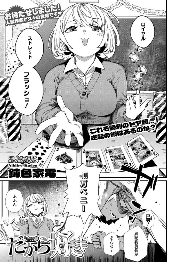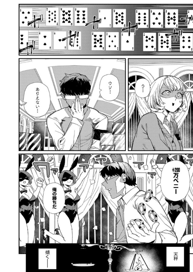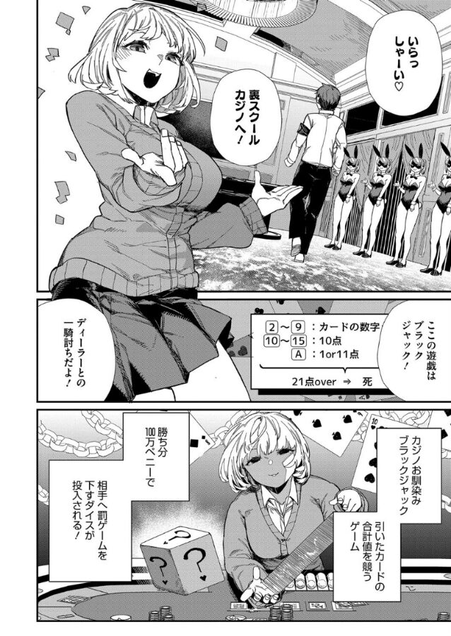 三ツ門学園の学園祭に「裏カジノ」が出店している!? 風紀委員の戸羽はカジノを辞めさせるため、支配人の梶野との直接対決に挑む事に。梶野の童顔+巨乳に惑わされながら何とか勝利した戸羽に、究極の選択が突きつけられる。それは「カジノを停止させる」か、「梶野のおっぱいを揉める」のどちらかを選ぶこと……! 生真面目童貞ゆえに、悩み苦しんだ挙げ句「おっぱい」を選んでしまう戸羽。そして「童貞ちょろ♪」とほくそ笑む梶野。しかしその時、戸羽はすでに場を支配していた。ギャンブルとエロスの極限状態で覚醒した秘奥義によって、賭け金も梶野のムチムチボディもすべてを手に入れる――!