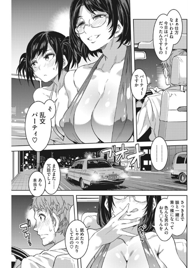 タクシーを拾った母娘の格好は、驚きのヤリマン超露出ミニ。訊けば、乱交パーティの帰りだとか、ウチの娘がすっかりハメ好きに育っちゃって…と説明する母も、チ○ポ大好きなクズ女だと自己紹介。娘と揃って挑発のマ○コ剥き出しポーズで車内ハメハメを促す。母娘で運転手とハメ倒した後、娘を先に帰して、ヤリマン母は、夜通し不倫マ○コに耽るのでした。