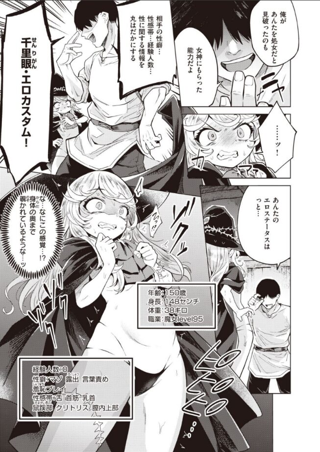 北の魔女のもとに行った村の男性たちがみな口を揃えてヤバいと彼女を恐れるため、調査を頼まれた冒険者が報酬に釣られて魔女の庵を訪れるなり、露出度の高い衣服を纏った魔女が現れ、トラップに引っ掛かって拘束されてしまうところにワクワクしました。 150歳という実年齢には思えないほど魔女の見た目は若々しく、身動きが取れない冒険者の身体を足でグリグリして己の力を知らしめようとするものの、彼が元AV男優だったという異色の経歴から、その触り方で経験豊富どころか処女だとあっという間に見抜かれてしまい、顔を赤らめて動揺してしまう姿が可愛かったです。 しかも、冒険者のエロステータスを見抜く千里眼によって、魔女の性癖から普段のオナ方法まで瞬時に暴かれてしまい、本当は処女であることに焦りを感じていることや、エッチがしたくてたまらないことまでバレてしまうところに、ニヤニヤしてしまいました。 巧みなテクを持つ冒険者にエッチという形で討伐される魔女は、口では強気なことを言いながらもその快楽に悶え、しかも自分の性癖をピンポイントで攻めて満たしてくる冒険者に、喜びすら感じているように見えてしまうところが見どころだと思いました。 |