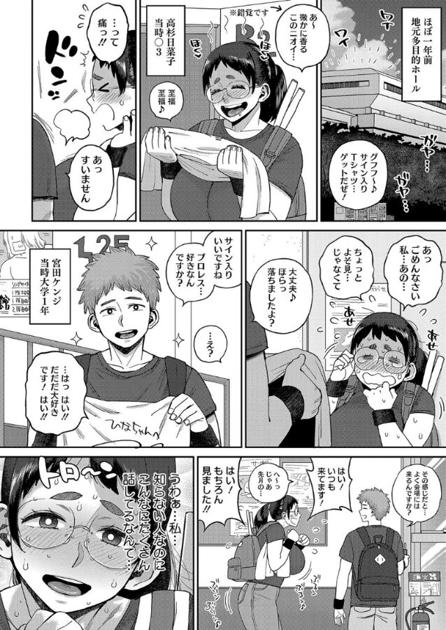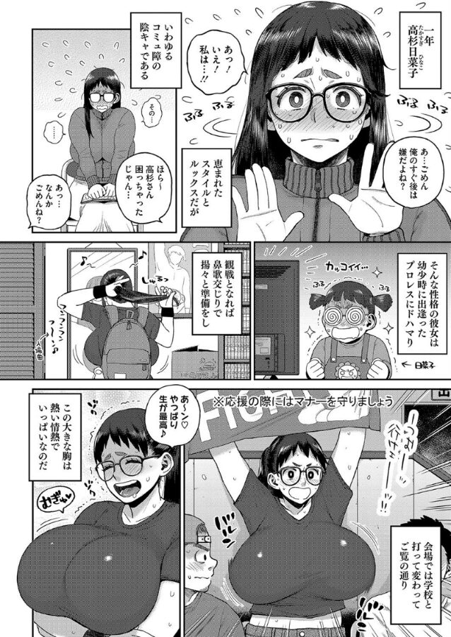 新入生の日菜ちゃんは憧れの先輩・宮田さんに誘われてプロレス研究会に籍を置くことに。ただ、日菜ちゃんは陰キャな性格ゆえ、サークル部屋で皆の会話に参加できないでいた。しかも宮田さんから、一緒に帰ろうという誘いも気持ちとは裏腹に断ってしまう始末……。ひとり落ち込む日菜ちゃんの視界に入ったのは、さっきまで宮田さんがふざけて被っていたマスク。思わず手に取り、宮田さんの匂いを堪能していたら思わずアソコがキュンと反応してしまった!! 発情を我慢しきれずパンツを脱ぎすて、ジャージをたくし上げて爆乳を揉みしだき、宮田さんを思いながら激しく指でアソコをかき回していたら──!!?