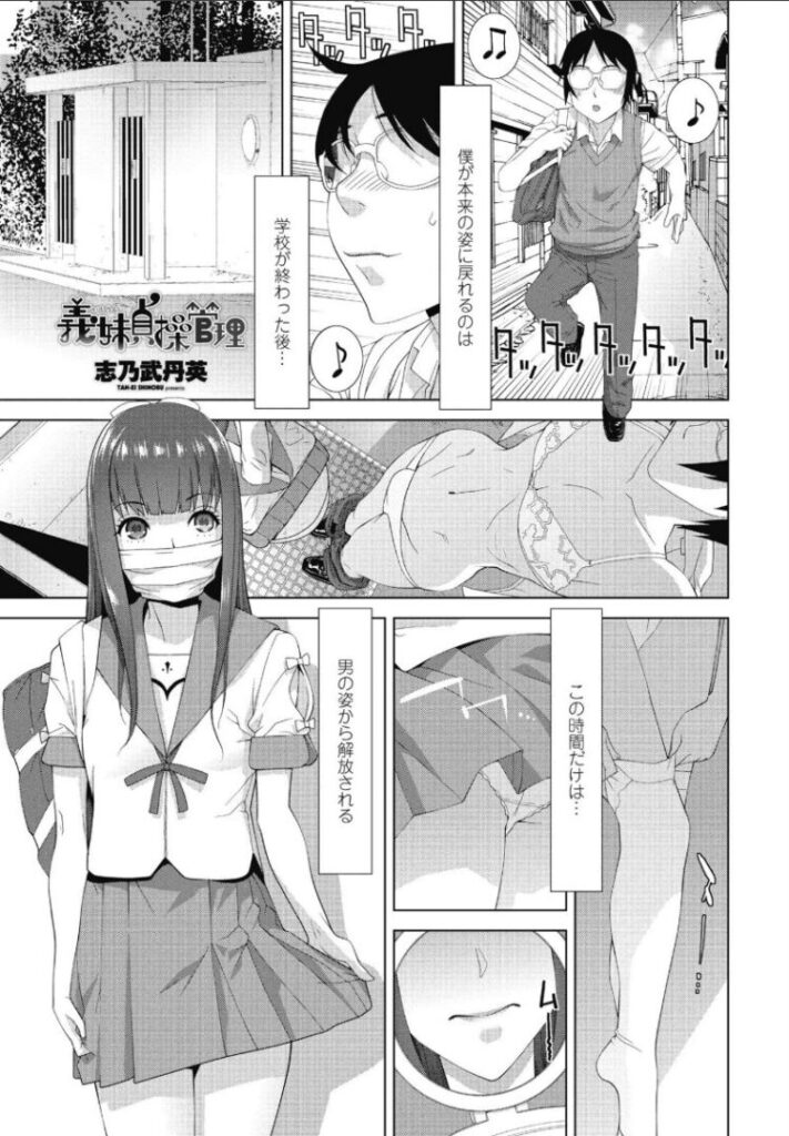 志乃武丹英「義妹貞操管理」義妹に強●されていた女装はいつしか本来の自分の姿と思えるようになっていた。だけど陰茎を押し込めるフラット貞操帯で一週間も勃起を禁じられたのは苦しくて、外して欲しいと懇願するのだが…。