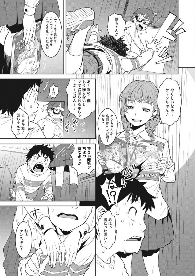 こよみは秘密基地にしている小屋で、あや先生からもらったバイブでオナニーしようと急いでいた。小屋には近所の男子たちが入っており、隠し持っていたエロ本を読んでいた。逃げ出そうとした一人を捕まえたこよみは、男子にお互いの裸の見せ合いっこをしないかと誘う。バイブではない生の肉棒を求めて疼いているのだ。