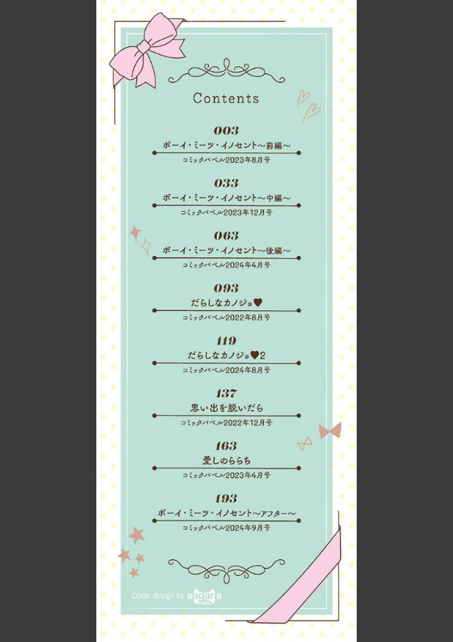 【心のナカまで、ぐちゃぐちゃにして欲しいの…】執着心と依存の果てに見つけた‘本当’の愛の形。大人ロマンスが紡ぐ淫美作家・茨芽ヒサの2ndコミックスがついに発売!!今回は表題作となった電子書籍でバズった注目作『ボーイ・ミーツ・イノセント』シリーズを完全収録!SNSでエロツイする自称ドM女『海月』と過去にトラウマを持つドS男『栞』。歪んだ性癖を持つ二人はSNSで出会い、お互いの欲求を満たしてゆく。やがて栞は恋心を抱き始めるが、あるトラウマから海月を本気で犯してしまい…!?傷つけ合いながらも愛し合う、読み応えバツグン90P超に及ぶ歪なエモエロ恋愛ストーリー♪その他にも、完璧主義なOLとのイチャラブSEXや、地雷系ヒロインとの刹那的Hなどなど…繊細な感情描写×ハードエロスが絡み合う極上エロス7作品をお見逃しなくっ!!さらにデジタル特装版には、単行本未収録の『ボーイ・ミーツ・イノセント〜アフター〜』をどーんと10P収録っ♪ 大人気『ボーイ・ミーツ・イノセント』待望の続編っ! 栞の家で放置されて発情しちゃう海月の過激&胸キュンSEXをご堪能ください!★無料サンプルで1話まるごと試し読み公開中★<収録作品>ボーイ・ミーツ・イノセント〜前中後編〜だらしなカノジョだらしなカノジョ 2思い出を脱いだら愛しのららちボーイ・ミーツ・イノセント〜アフター〜