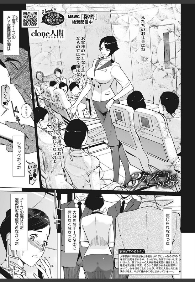 千夏がAV作品に出演している事が瞬く間に社内中に広まったが、今まで以上に凛として美しい千夏に同僚たちは肯定的だった。しかも男性社員やファーストクラスの乗客たちは千夏の牝フェロモンに籠絡されていく。そんな折、千夏のアナル解禁ビデオに同僚・セレブな乗客たちを巻き込んで旅客機での撮影を決行したのだった!!!