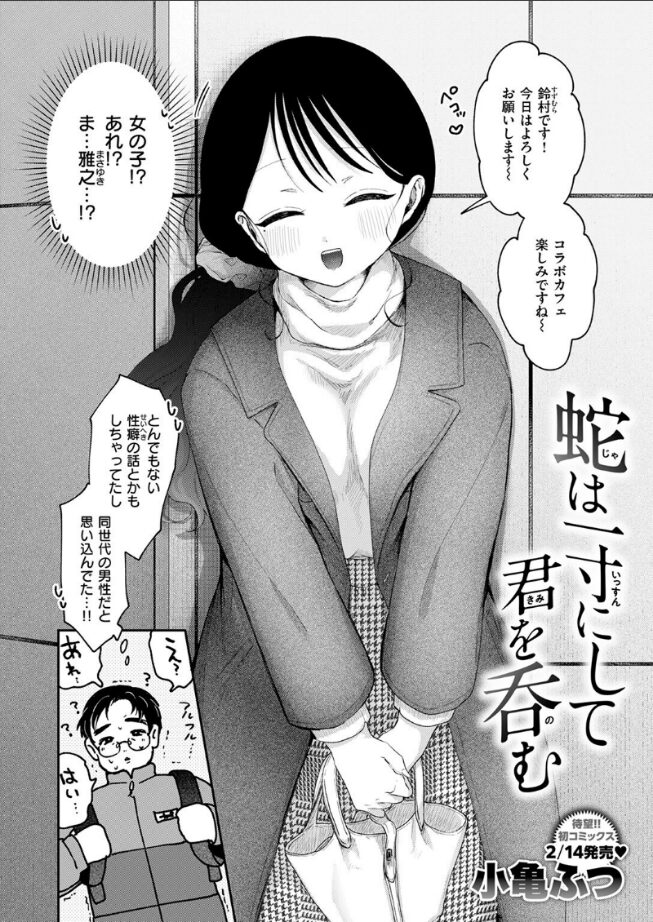 1ページ目から登場する女性が名乗っていた名前こそ「雅之」となっているものの、決して男の娘ものだったりフタナリものだったりとマニアックな内容ではないのでご安心を。 雅之こと鈴は可憐な感じのする女性がそれとは裏腹に肉食系なので人は見かけによらずと言った所。 意味深なタイトルから不穏なものも感じるかも知れないが、本作を一言で表してしまえば女性経験が少ないオタク君(悠真)が経験が多そうな女性にリードされるという平和なお話である。 しかし、ジワリジワリとにじり寄るように距離をつめてくる鈴の姿。ホテルについてから鈴が見せるジワッとした二面性にゾクゾクとさせられた。 大人しそうな女性に限って・・という感じで薄っすらとした女性の怖さみたいなものが描かれている。 同嗜好性を持った性癖同士という事で知り合った二人という話だが、Hシーン自体はノーマル。鈴は悠真の性癖を全て知っており、全て受け入れてくれるというラブラブセックスシーンが良い。 終わり方も普通に良い終わり方なので重い話が苦手な人にもオススメできる一作。 |