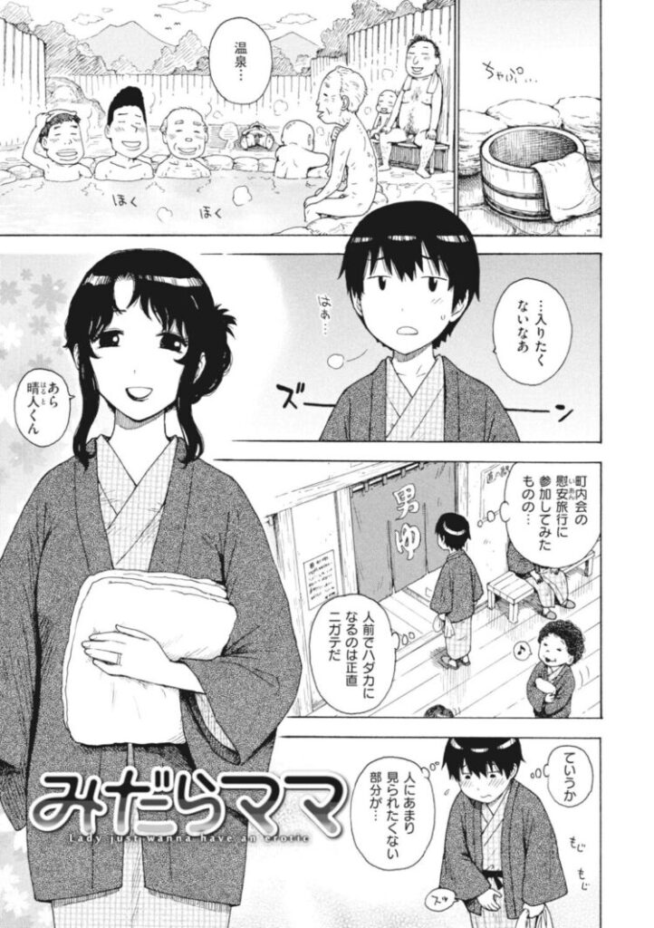 町内会の温泉旅行に来たものの、他人に見られたくないヒミツがある晴人(はると)は男湯の前で困っていた。そこに現われた『貸切温泉』へ向かう雪城(ゆきしろ)さんちの奥さんに声を掛けられ、なぜか一緒に風呂へ入ることに!?さらにはヒミツにしていた勃起ちん●んまで見られてしまって……。