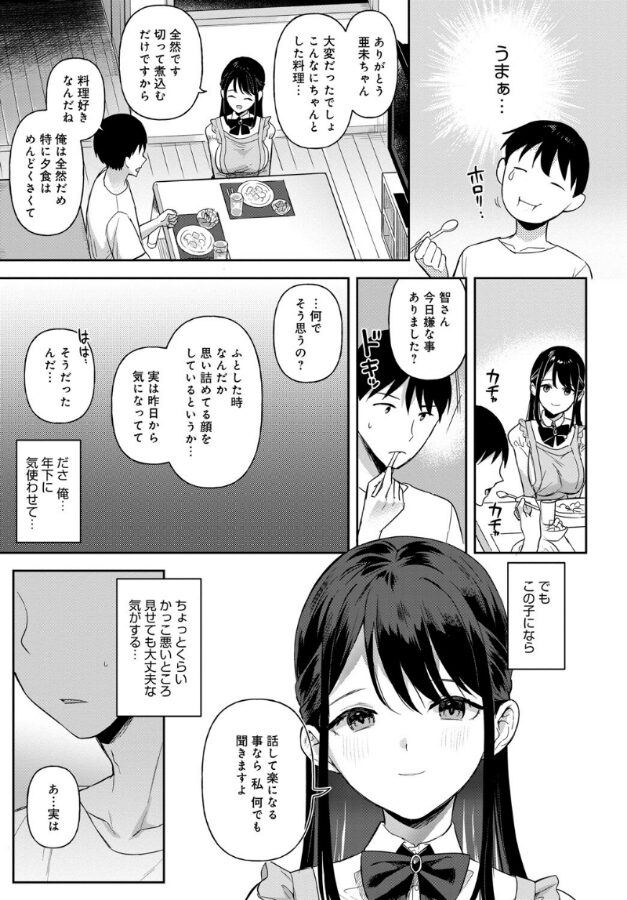 高学歴なのにうだつの上がらない日々を過ごす会社員・田中はある雨の日、見ず知らずのJK・亜未ちゃんに「今晩泊めてくれませんか?」とお願いされてしまう。自分が必要とされていることに心を打たれた田中は、亜未ちゃんを自宅に招き入れることに…。なんとか理性を保つ田中だったけど、全てを受け入れて田中に尽くす亜未ちゃんの母性に「もっと触れたい」と告げてしまう…。そんな田中の願いも優しく受け入れる亜未ちゃんは、セックスもご奉仕系で――☆やわらか巨乳のエロエース・うしのみや先生描く、家出JKはママみたっぷりのご奉仕上手♪