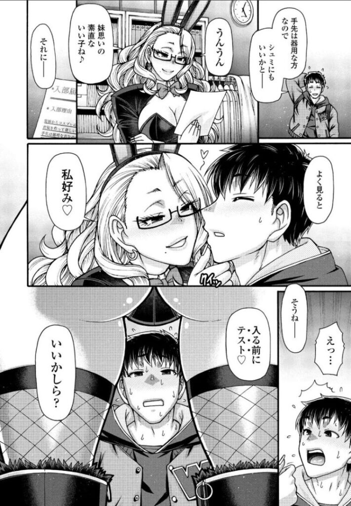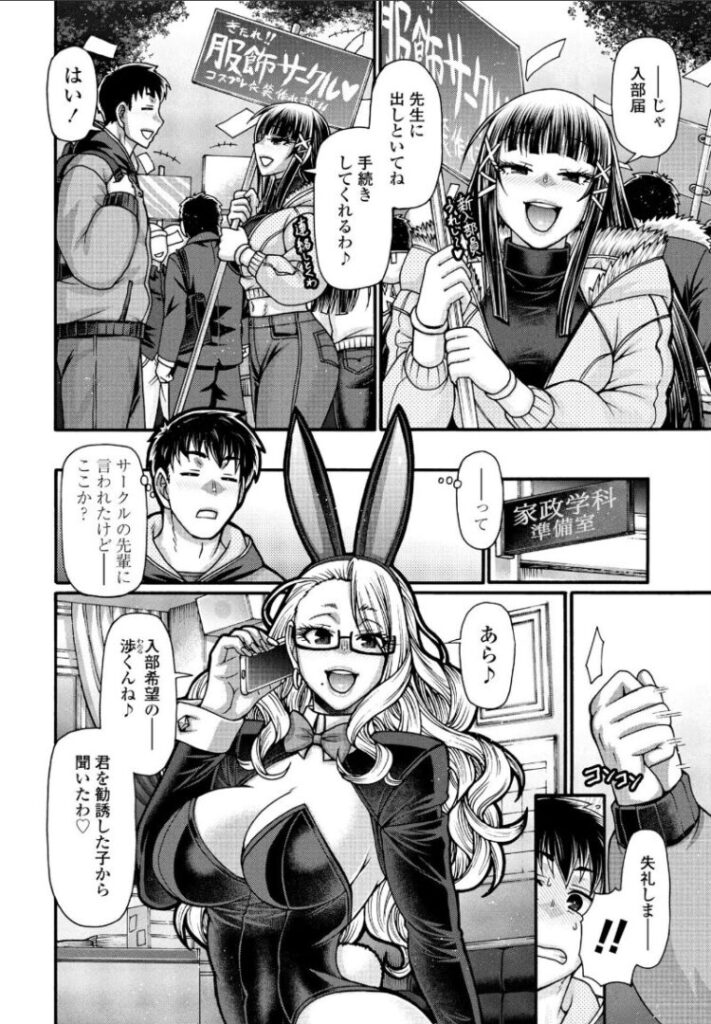 チバトシロウ「三月兎の誘惑 前編」コスプレ衣装を作りたくて服飾サークルにやってきた新入生を迎えたのはバニースーツに身を包んだ顧問。見学者を引き止めるためのサービスと言いながら彼に好色な目を向けた顧問は、入部テストと称して若いオスを貪り始めて…!