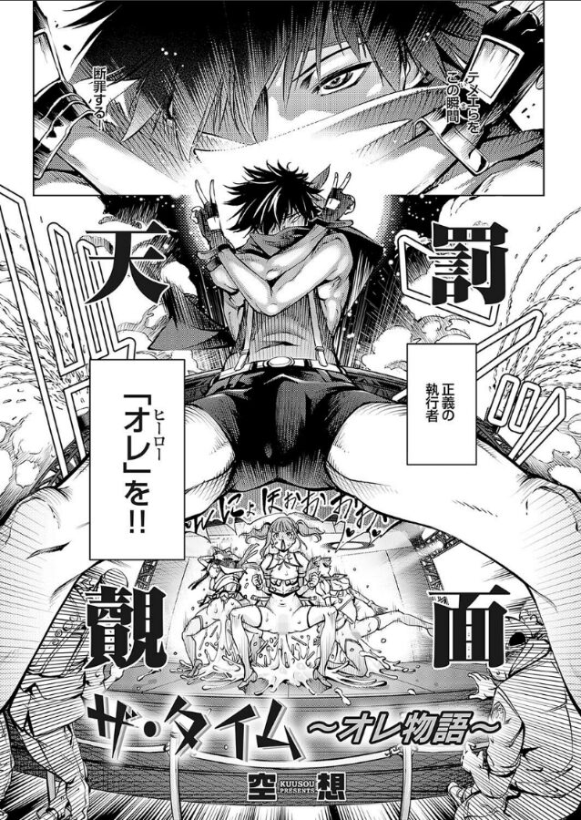 特濃描写を追求する空想がグレープ10周年記念に手がけるシリーズ読み切り第一弾!時間停止能力を手に入れたクズ男が思うままヤリ歩く!!嫉妬と憎悪に満ちた声が聞こえ、悪意に侵され濁りゆく見るに堪えないこの世界。町興しを建て前にさもしい性癖を満たそうとする浅ましい行為を具現化したかのようなご当地アイドルユニットが、過激パフォーマンスによるBBAからの批判にもめげず今日も尻を振る…そんなライブの最中、メスブタアイドルを断罪するため時代が求め現れた正義の執行者『オレ(ヒーロー)』。彼に与えられた才能は『時間停止』。男尊女卑を掲げる変態男が特殊能力を手に入れクレーマー女、電車で群がる女ども、コンビニ店員などなど…むかつく女どもに次々神の制裁…天罰(レ●プ)を与える。我が勝利、マヌケヅラと共に「天罰…覿面!!」