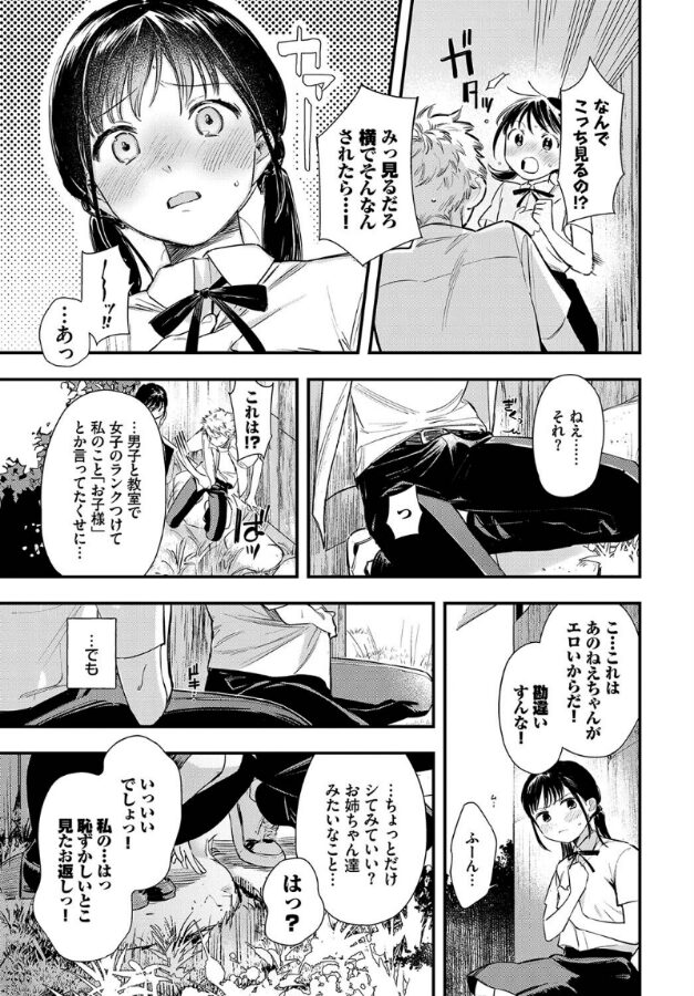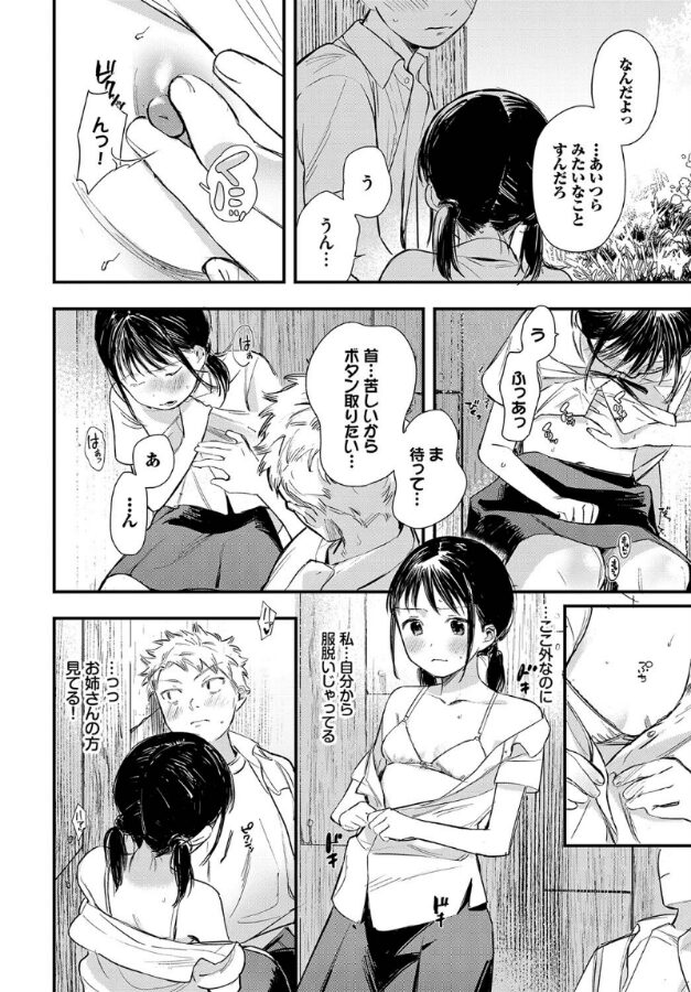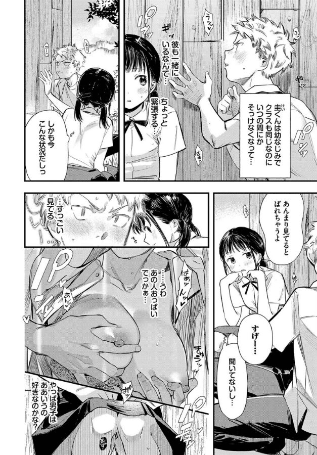 幼なじみの初めてエッチ。バス停でセックスを目撃した圭と吉野。エッチな声と音にあてられ、我慢できずに吉野は自身の胸をいじり軽くイッてしまうと、隣にいた圭に見られていた…。二人は悶々とした気持ちになり見よう見まねで初めてのエッチを体験する。大人の階段を登る少年少女達の、あどけなさと妖艶さが入り混じる初体験譚を描いく、美作画ルーキーの衝撃デビュー作!!