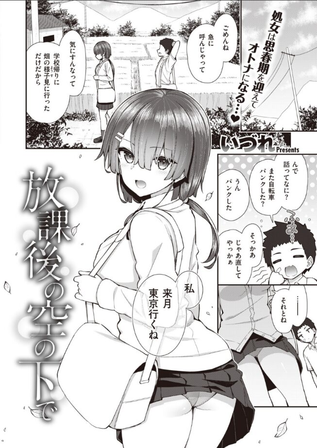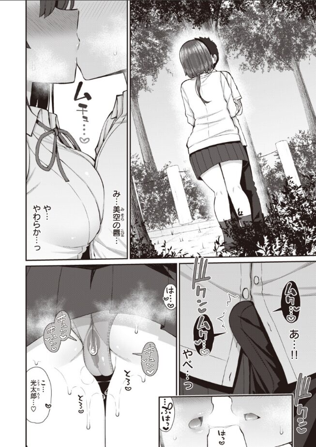 「年上の幼なじみとじゃ…やだ?」光太郎(こうたろう)と美空(みそら)は田舎町で育った1歳違いの幼なじみ。農家の息子の光太郎が畑仕事をしていると、学校帰りの美空がやって来た。自転車のパンクの修理をしてほしい、それと「私、東京に行く」から……と。子供の頃からの夢であったデザイナーになるために家を出ると決めた彼女であったが、どうしても、済ましておきたいことがあるという。「上京する前に…大人にしてほしいの…ファーストキス…」いやらしいことと勘違いしそうになったが、美空のためにひと肌脱ぐ光太郎。最初は柔らかくて甘いキスだったが気持ちの高まった美空が思わず…「…しちゃう…? キス、以上のことも……」幼馴染以上、恋人未満の2人が最初で最後の想い出を激しく紡ぐ……処女×童貞物語ーー。