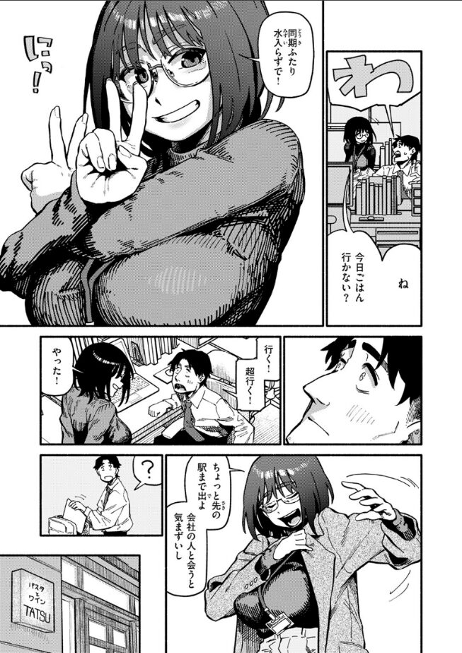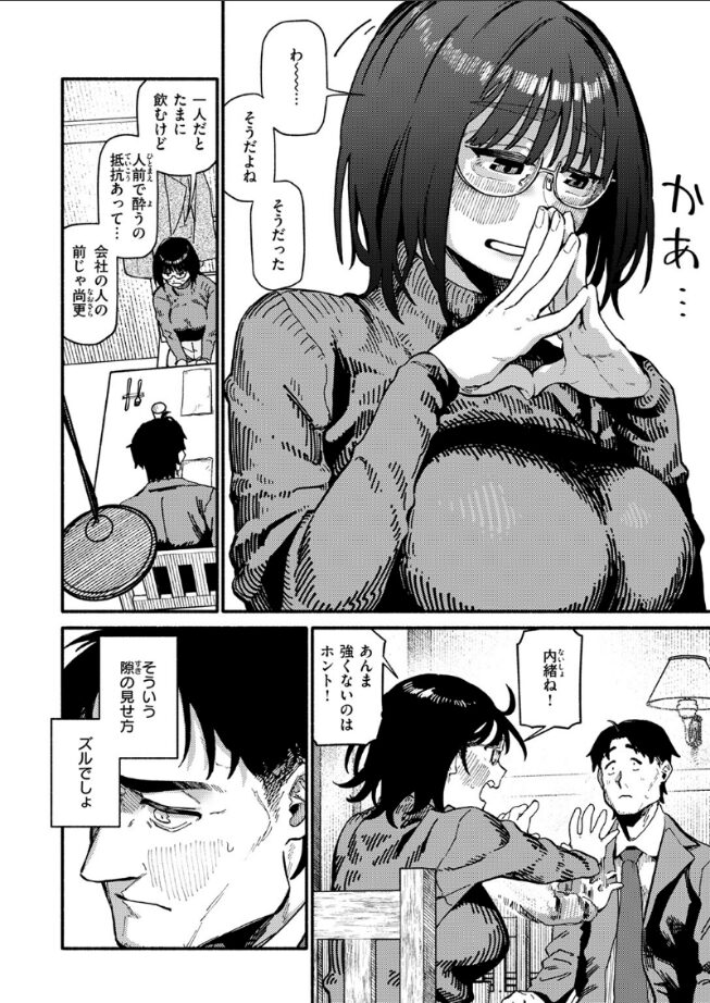 ふぞろい めがね巨乳の地味系女同僚と居酒屋で酒を飲んだ勢いでセックスw 【層積 エロ漫画】
