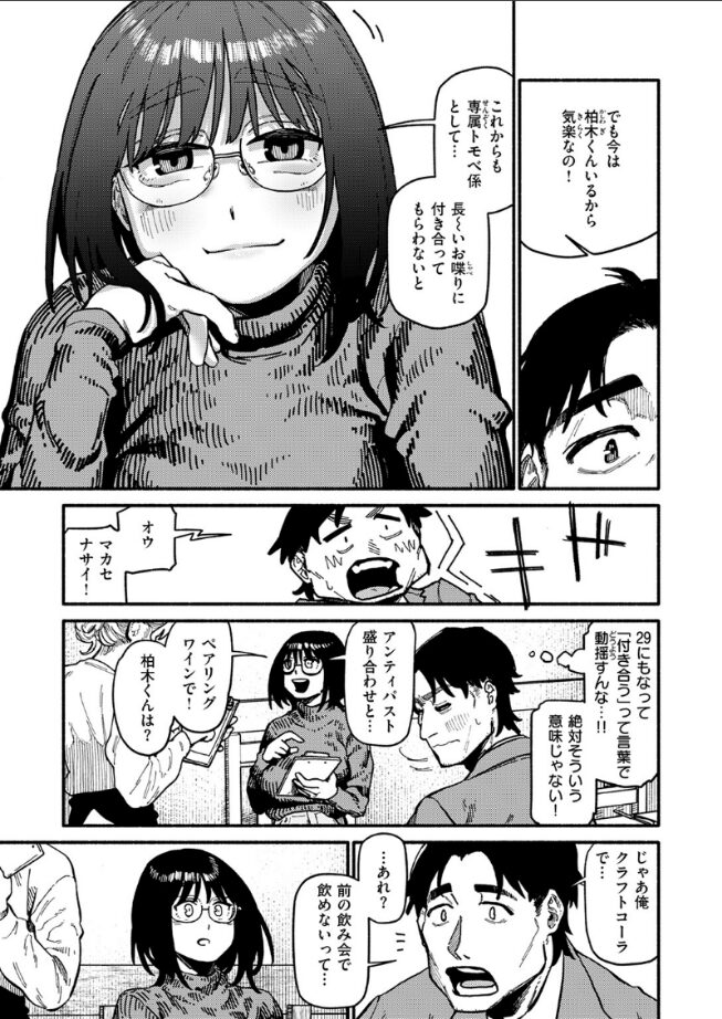 誰にでも好かれて人当たりの良い同僚(友部さん)と不器用でちょっと冴えない主人公’(柏木)、というふぞろいではあるものどこかお似合いの二人が良い感じ。