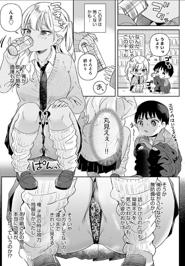 冴えないおじさんが、ジョギングの途中でおじいさんから仕方なく購入した若返りドリンクを飲んだところ、着ていたウェアやメガネのサイズはそのままに身体だけが小さくなってしまい、戸惑って涙しているところに、見覚えのある苦手なギャルが心配して声を掛けてくるところにワクワクしました。 ギャルは泣いているのを心配して、自販機で買った推しのドリンクを飲ませてくれたりと見た目とは違い優しかっただけでなく、自分が小さいことで異性としての警戒心がなく、パンツが丸見えだったり後ろから抱きかかえてきたりと、若返ったことによるメリットに幸せを感じてしまうところが、中身はおじさんだと思いました。 そして、公園で遊ぼうというギャルの話に乗って、ここぞとばかりにくっついて滑り台で遊んだりしているうちに、興奮して大きくなってしまったモノを元に戻すようお願いすると、承諾してもらえるというまさかのオチに、若返りの効力を噛みしめるところが面白かったです。 |