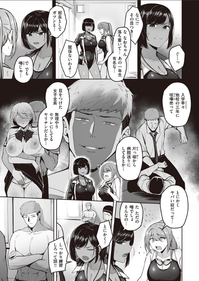 SNSの裏アカにオナニー画像をアップしていることを知られてしまったナオが、ヤリチンの新入生にセックスを要求されるストーリー展開です。 ナオは水泳部に所属しているという設定なので、競泳水着を着用した状態で最後までHシーンが行なわれていてフェチズムを感じましたし、ナオの日焼け跡がくっきり残っていて体付きがセクシーでした。 部室でいきなりバックの体位で膣奥までペニスを挿入されて一瞬でナオが絶頂してしまうシーンもエロかったですし、バックで中出ししているペニスの様子が断面図で描かれていてHシーンにライブ感がありました。 激しく正常位されて快楽に堕ちたナオが、積極的にペニスを求めてくる後半のHシーンも迫力満点でしたし、中出しされて放心状態になっているナオの膣の中から精液が大量に溢れているシーンもエロくて興奮しました。 |