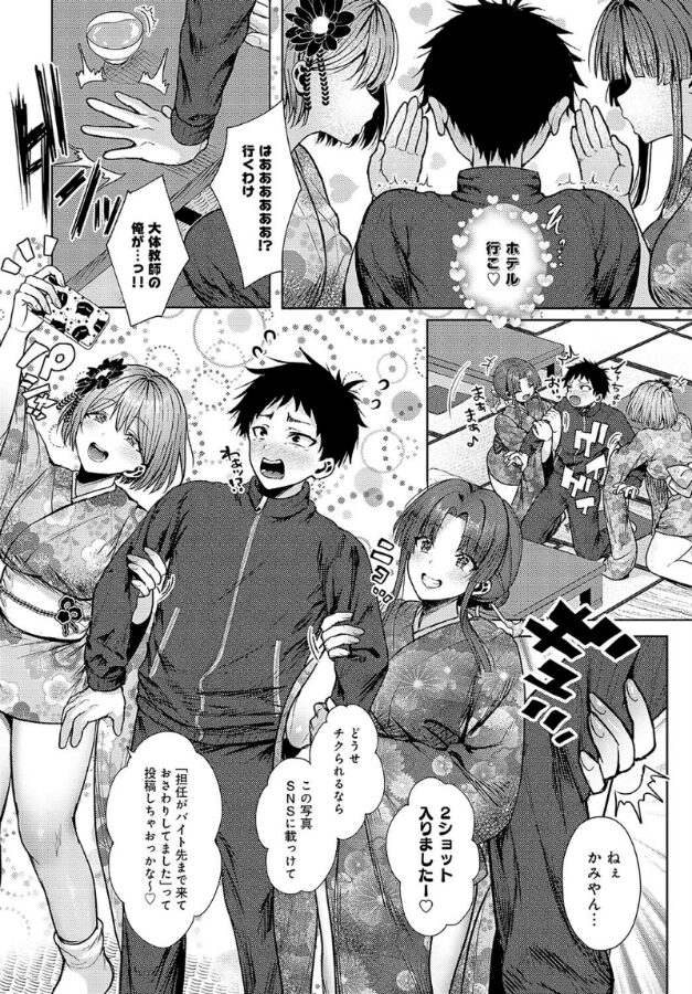 何度注意しても改めようとしない生徒2人に手を焼いているかみやんが、癒やしを求めて彼女たちとは正反対の清楚系美女のいる和風コンカフェに行ったところ、まさかの問題児2人が出迎えし、場が固まるところが面白かったです。 教師としてガミガミ注意するかみやんに対し、サクッと3人一緒の写真を撮ってSNSに投稿すると脅し、取引を持ちかけるところはさすがギャルといった感じで、学校にバレたら自分の方がクビになってしまうという懸念から、バイト後の彼女たちとホテルに行ってしまうかみやんの選択も、妙にリアルだと思いました。 露出度の高いコンカフェの衣装のまま現れた生徒2人に挟まれたかみやんが、教師としての理性から絶対手を出さないと心に決めるも、ギャル2人も処分を回避するために必死で、胸をあらわにした彼女たちに挟まれ挿入を求められたところで、理性が一気にぶっ飛んでしまうところも面白かったです。 かみやんとギャル2人の関係性も、舐められた教師とフレンドリーな生徒といった感じで、親近感があるからこその展開が最高でした。 |