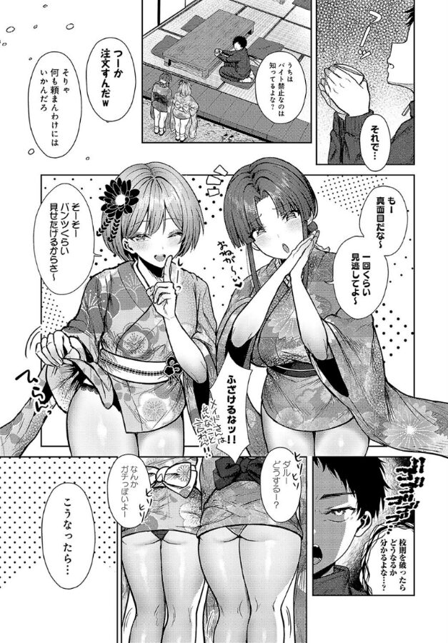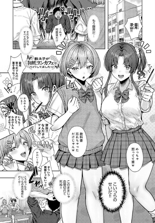 教え子とのハーレム3Pセックスが楽しめる作品。 担任である主人公は、「霜月(しもつき)」と「深山(みやま)」という二人の問題児に悩まされています。 日頃のストレスを癒すため、和風コンカフェを訪れると、霜月と深山がバイトをしている場面に遭遇。 二人に流されるままホテルに行き、3Pする展開に! ミニスカの和服でコスプレHするのが興奮します。 陽キャのギャルが積極的に担任に迫るシチュエーションが良いですね。 理性が崩壊した主人公が、教え子にエロエロな指導をするのが堪りません。 ストレスの元凶であった二人の教え子と担任教師が、卑猥な関係になってしまうストーリーが良かったです。 |