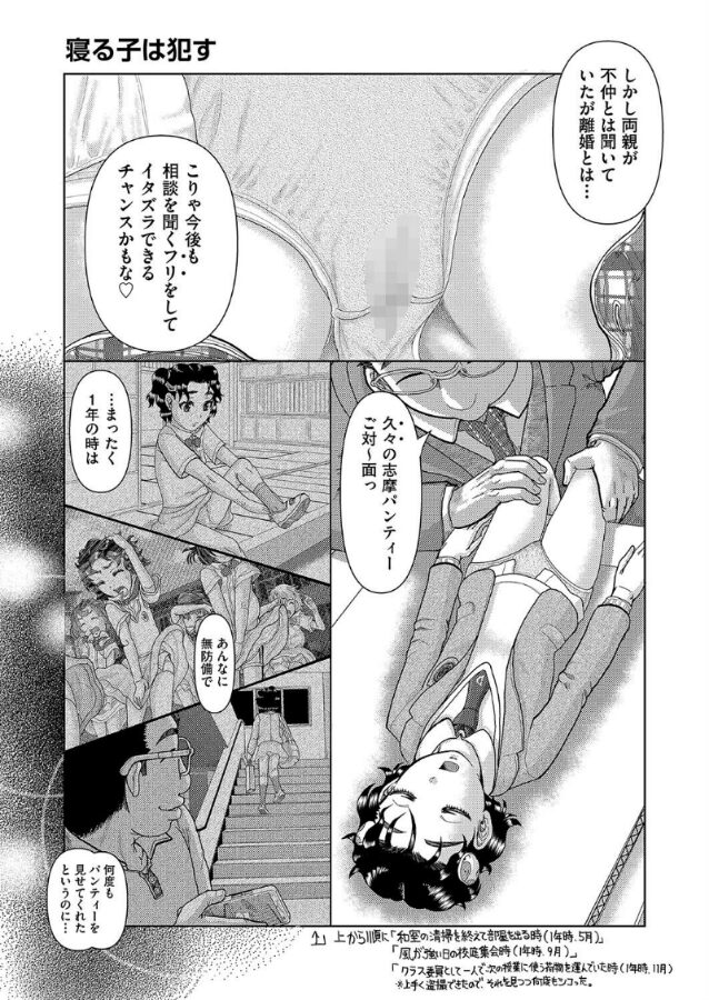 両親が問題を抱えて荒れていた女子生徒。先生と何度も話すうちに心を開いてすっかり頼りの存在となっていた。だが先生には裏の顔があった。二人きりの相談の席で出されたお茶を飲んだ女子生徒は深い眠りに落ちる。それを確認した先生は下卑た笑いを浮かべながら衣服を捲くり、白い下着をずらして久しぶりの●●性器を指で確認しながらスマホで撮影を始める。先生は女子生徒が気付かぬ内にこうして度々その身体を味わっているのだ。