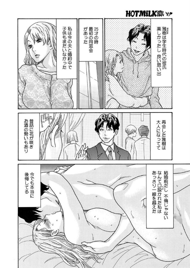 同窓会で元彼に会うのは2度目。前回は自分に婚約者がいながら、婚前だしとつい流されてSEXをしてしまった苦い記憶が頭をよぎる。しかし、若くてイケイケだったあの時とは違いすっかり尾羽打ち枯らす様子の元彼を放っておくことができず、ついつい優しくしてしまった挙句に…?