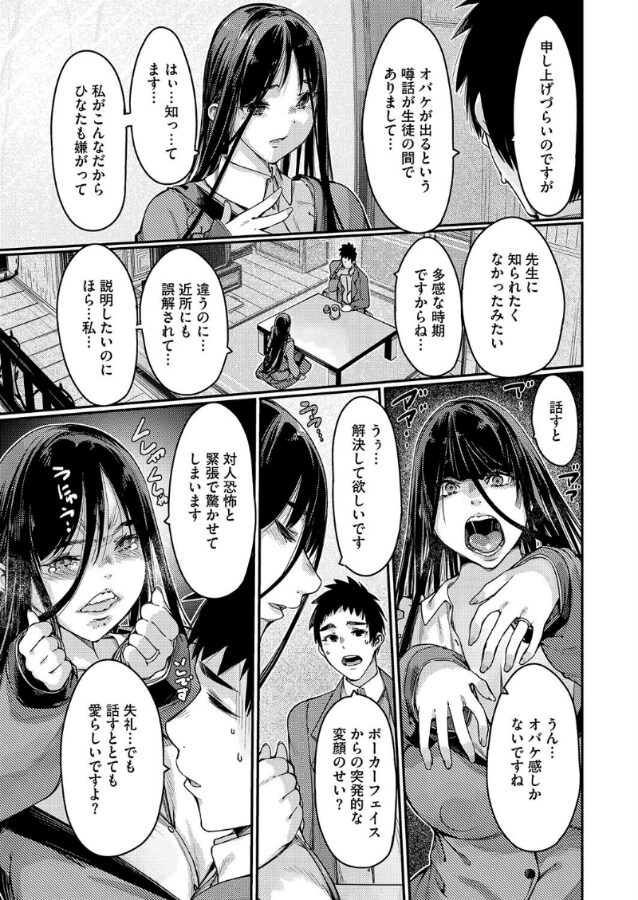 家庭訪問先に行ってみると、なんと近所で評判の女の幽霊が出るというお宅だった! 恐る恐るノックをするが返事がない、仕方がないのでドアを開けてみると、で、で出た〜!? と思いきや、落ちついてみれば、教え子の母親だということが判明した。 曰く、コミュ障すぎてご近所に幽霊と勘違いされて困っているのだという