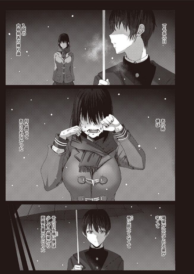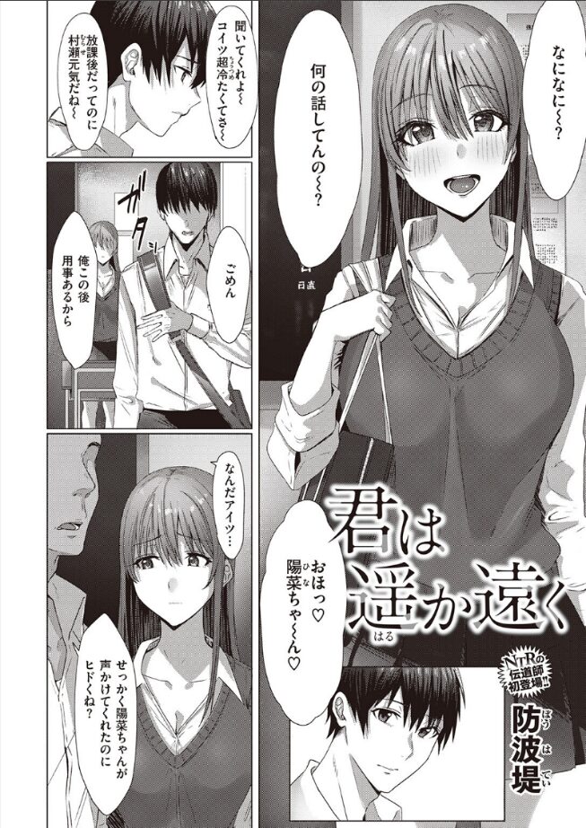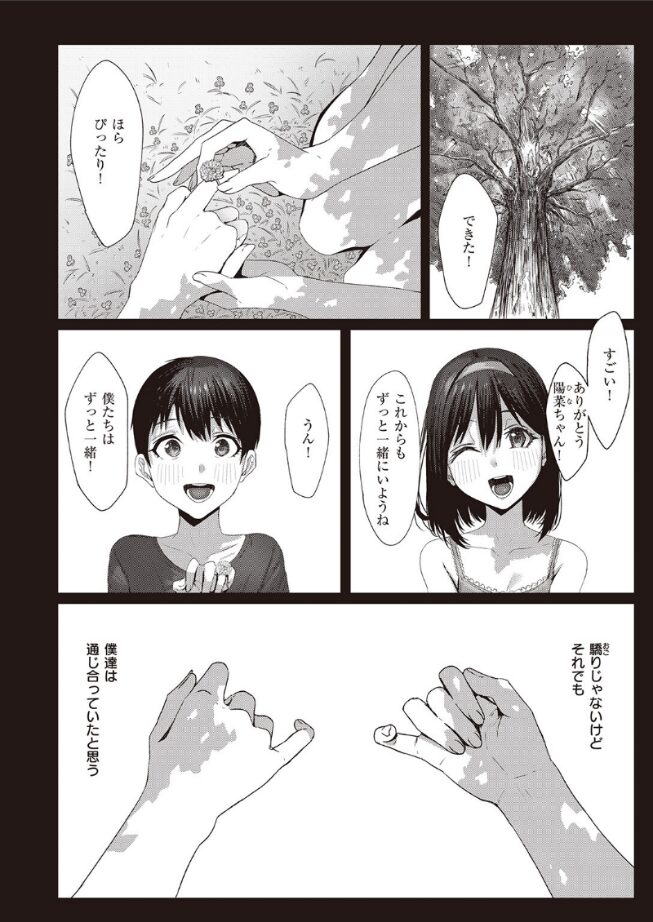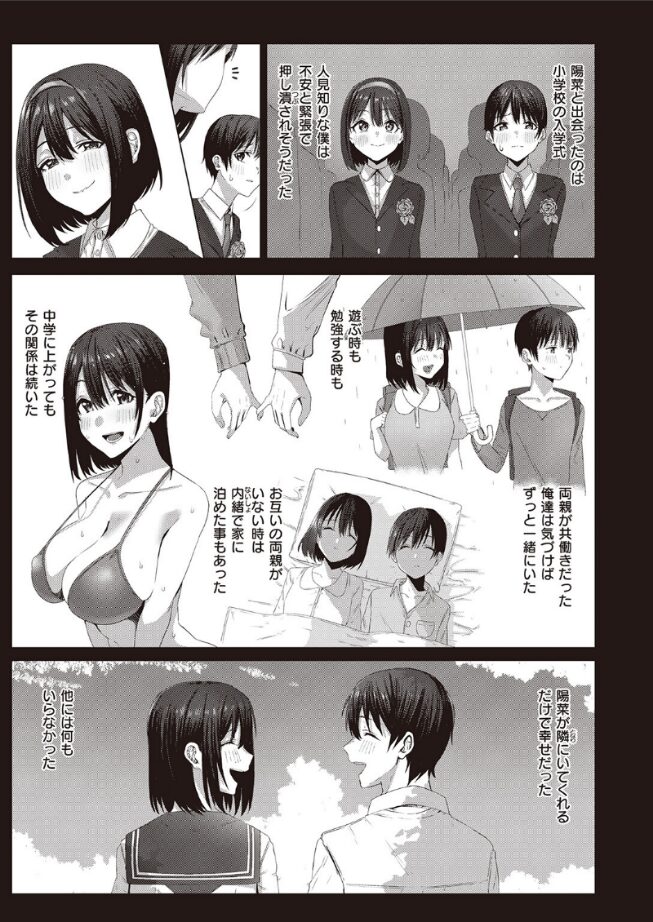 密かに幼馴染である陽菜への想いを持ち続けている主人公の篠原だが、陽菜もまた篠原への想いを持っている。 そんな中で陽菜は同級生の村瀬とセフレ関係になってしまっているというのが何とも切ない。 村瀬と陽菜のHシーンではすっかり「駄目な女」になってしまっている陽菜の姿がこれでもかってくらいに描かれる。 篠原も陽菜も昔から変わらない部分をきちんと持っているにも関わらず、お互いの気持ちに触れることなくすれ違う。 果たして二人はお互いの気持ちに気づくことが出来るのだろうか。 ラストのコマの台詞よろしく答えは見つからない。 |