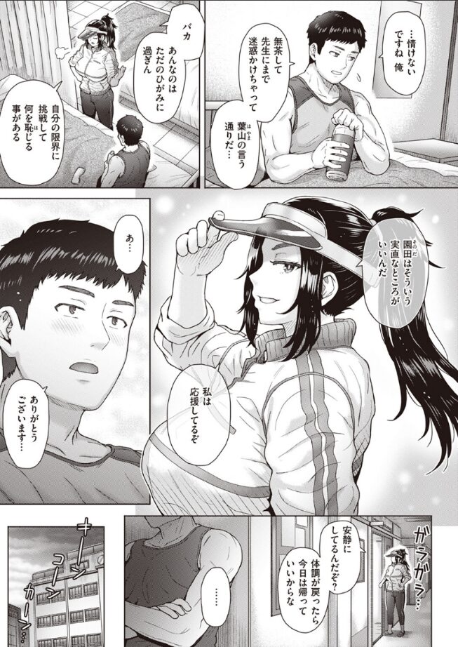 陸上部の副顧問である宮部先生は、女性ということもあり、鬼コーチのいないときは部員から舐めた態度を取られていたものの、コーチがいなくてもしっかり練習を続ける自身のことを認めてくれていたため好印象を持っていたのに、無理が祟って保健室のベッドで眠っていたのをきっかけに、じつは部員の葉山とデキていることを知るという衝撃にワクワクしました。 常に男っぽい口調の宮部先生が実はドMで、生徒である葉山の言いなりになり、カーテン越しに自分が寝ているのを知りつつも行為に及び、バレることを危惧しつつもそれが一種の興奮材料となって、どんどんエスカレートしていくところがよかったです。 それ以降、信頼していた宮部先生に裏切れた気持ちになり、あっさり部活をやめてしまうところも、10代らしいなと思いました。 |