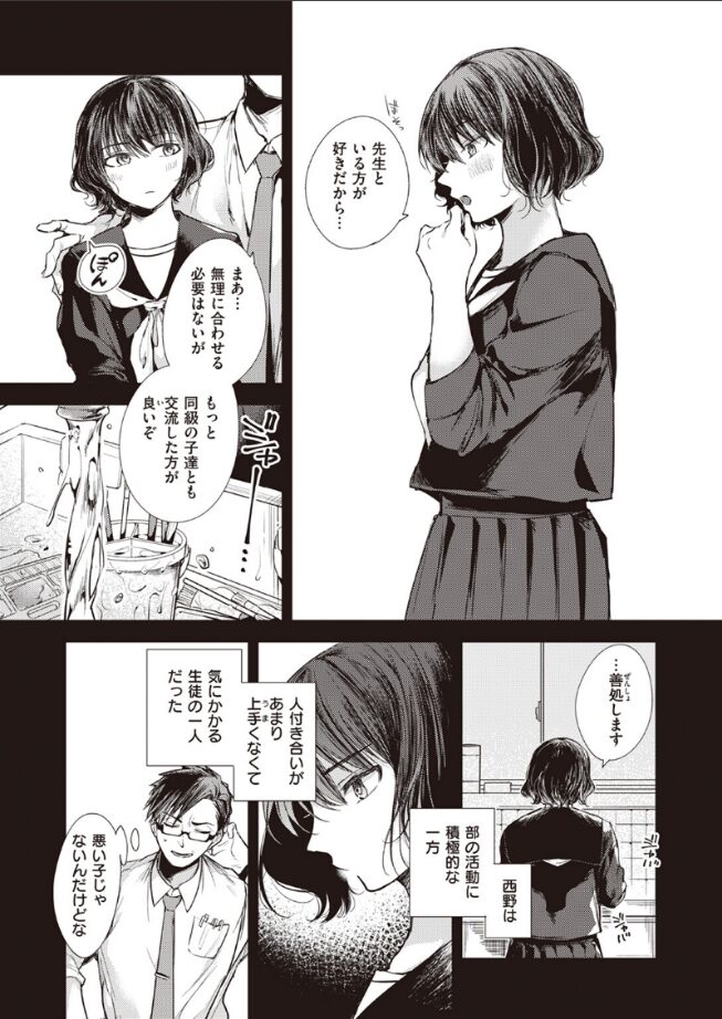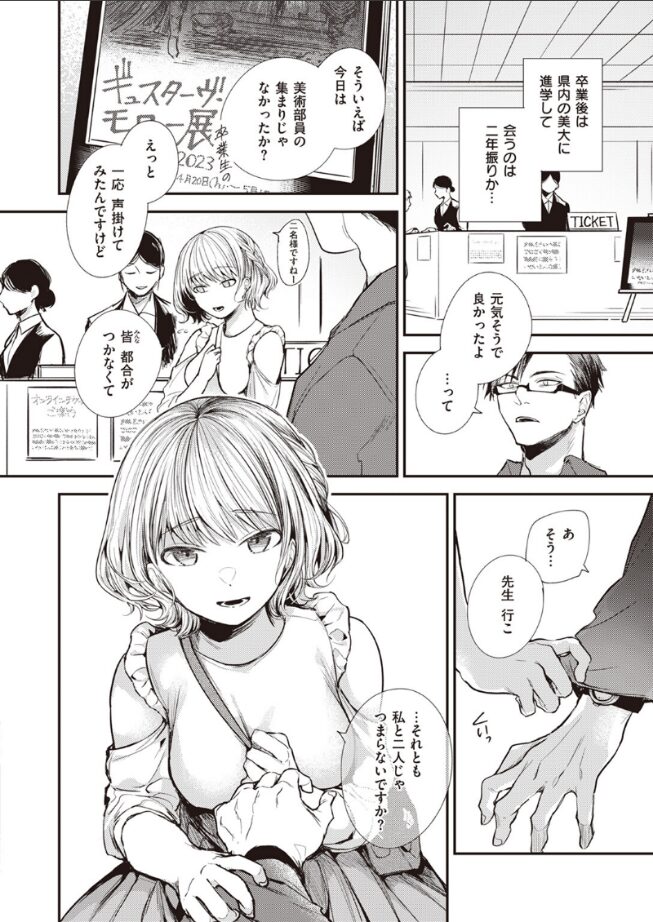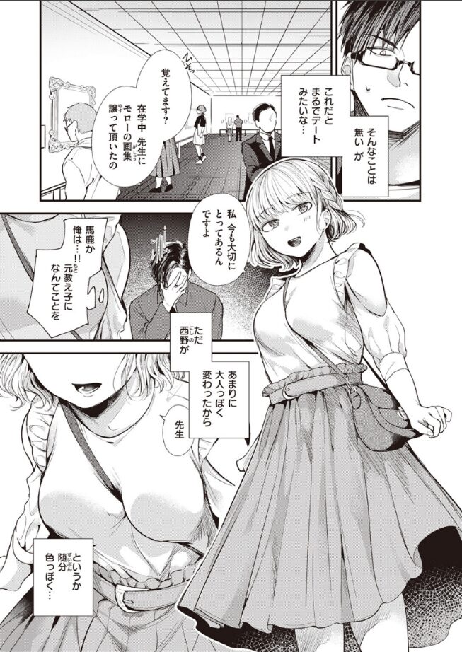 「先生、私変わったでしょ。服もメイクも。他にも色々勉強したんですよ。男の人の悦ぶこと……♪」教え子だった西野は美術部の部活動には積極的な一方で、人付き合いがあまり上手ではなく気にかかる生徒のひとりだった。久しぶりに元美術部の集まりがあると呼ばれたので足を運ぶと、すっかりと垢ぬけ綺麗になった西野の姿があった。忘れられない先生に、オトナの味を覚えた元教え子が猛烈アプローチをかける。