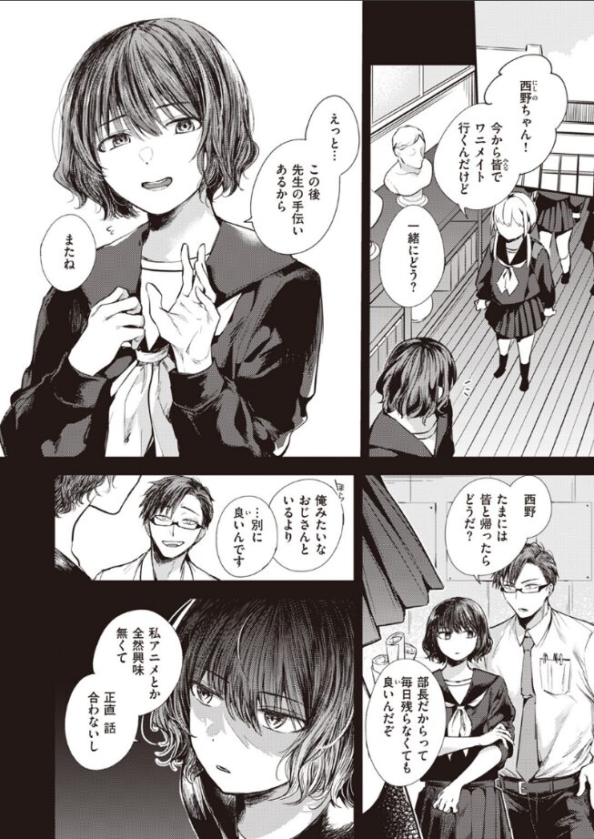 主人公の元教え子である西野という女の子が、垢抜けて先生のことを誘惑するという刺激的な展開が楽しめるのが良かったです。 先生と生徒という関係が過去にあったからこそ、二人の距離が縮まっていく度にドキドキさせられました。西野は別人レベルに変化していて、陰でいろんな努力をしたんだろうなぁと思いました。 主人公は一応先生としての理性を働かせようとするのですが、西野が可愛すぎてだんだん理性を抑えられなくなってしまうのも見どころです。 |