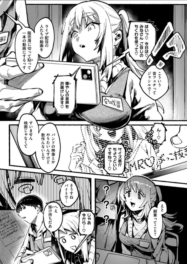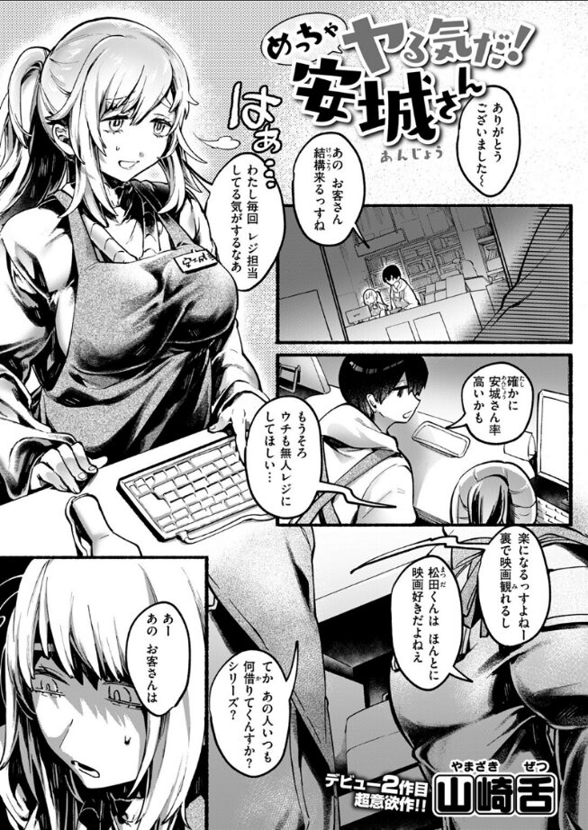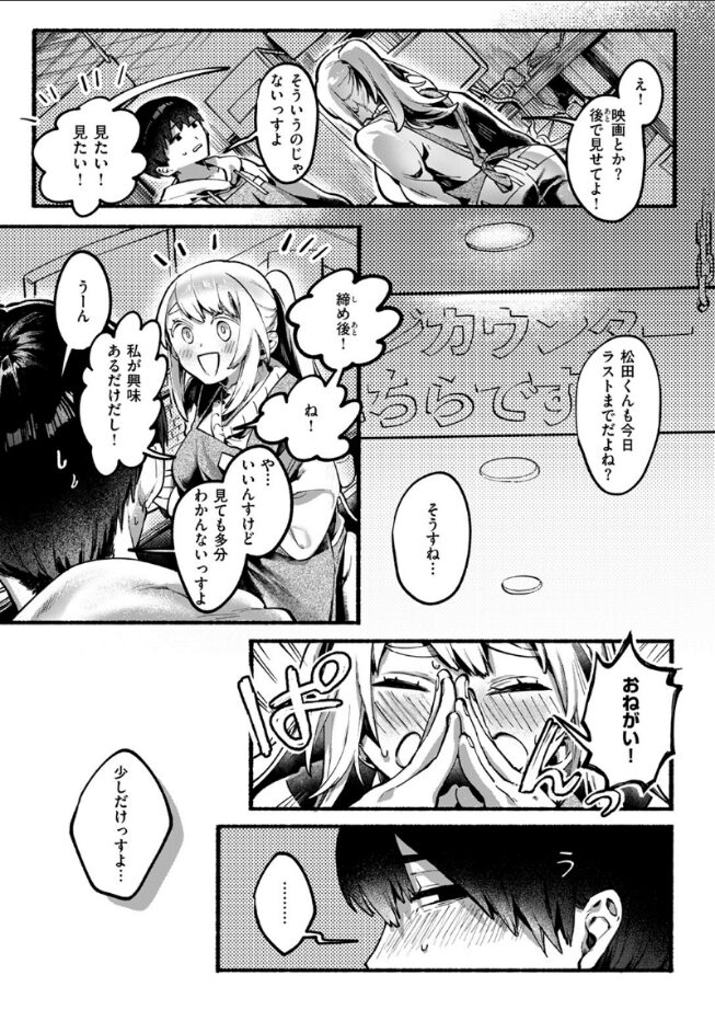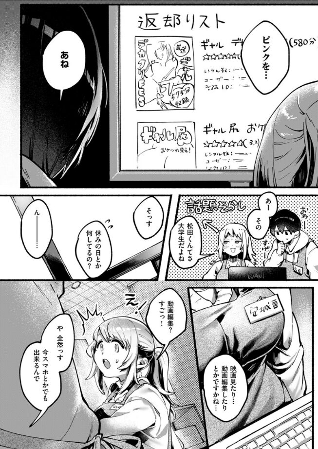 レンタルビデオ店でバイトしている安城さんが、同じ時間帯のシフトに入った松田くんと世間話をしているうちに、お休みの日は動画編集をしていると聞き、興味津々で就業後に作品を見せてもらうことを約束するも、その動画はエッチな作品で気まずくなってしまうという展開が面白かったです。