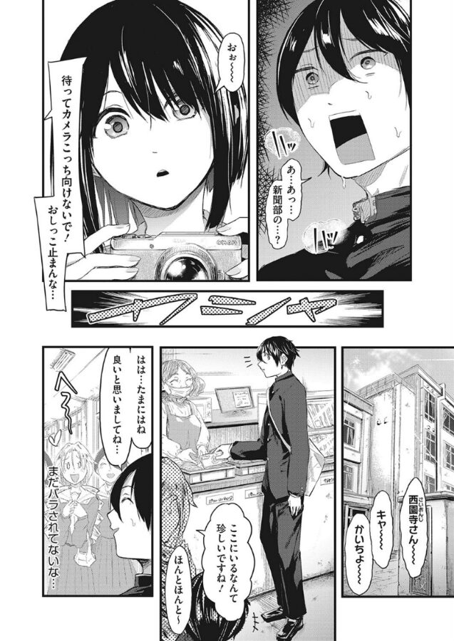 生徒会長の西園寺光一は、立ちションをしているところを、あろうことか新聞部の泉見さんに撮られてしまった。翌日の昼、パンを持って新聞部に行くと、部員の稲沢さんにはすでにバラされている。これ以上バラされないようにと、新聞部の部室に通って懇願する光一だが、それを妬んだ女子生徒が、新聞部の部室を荒らしてしまう。カメラも壊された泉見さんに光一は…。