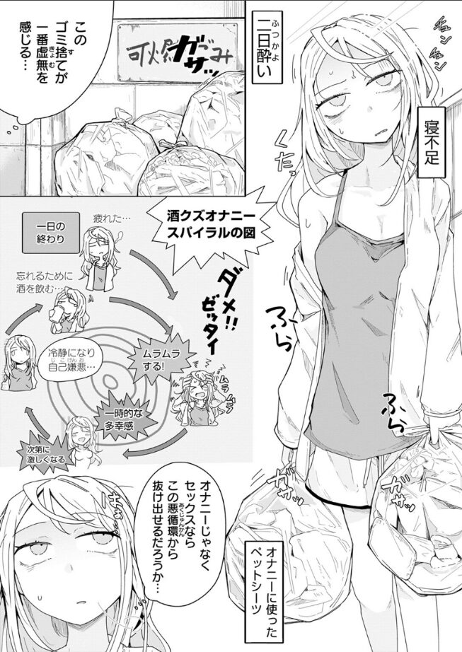 30代前半のフリーターで彼氏も友達もおらず、あるのは将来への不安と有り余る性欲だけというヒロインが、帰宅後は日課となってしまったオナにも少し飽き、どうにかこのルーティンから脱却しなければと考えるところが面白かったです。 そこで思いついたのが、バイト先の先輩である年下の大学生を相談があるからと飲みに誘うことで、親からの小言を阻止できる上、彼氏の存在を匂わせることができるという一石二鳥の閃きに、ヒロインがゆるゆる人生を歩んできた理由が垣間見える気がしました。 ベロベロになるまで飲んだ挙げ句、大学生に自宅まで送ってもらったのをきっかけに、ここで彼を帰さなければいつものルーティンから脱却できるはずと、ヒロインにウザささえ感じて帰りたがる彼を必死で引き止め、久しぶりの生身の男性にムラムラが止まらなくなり、暴走し始めるところが最高でした。 |