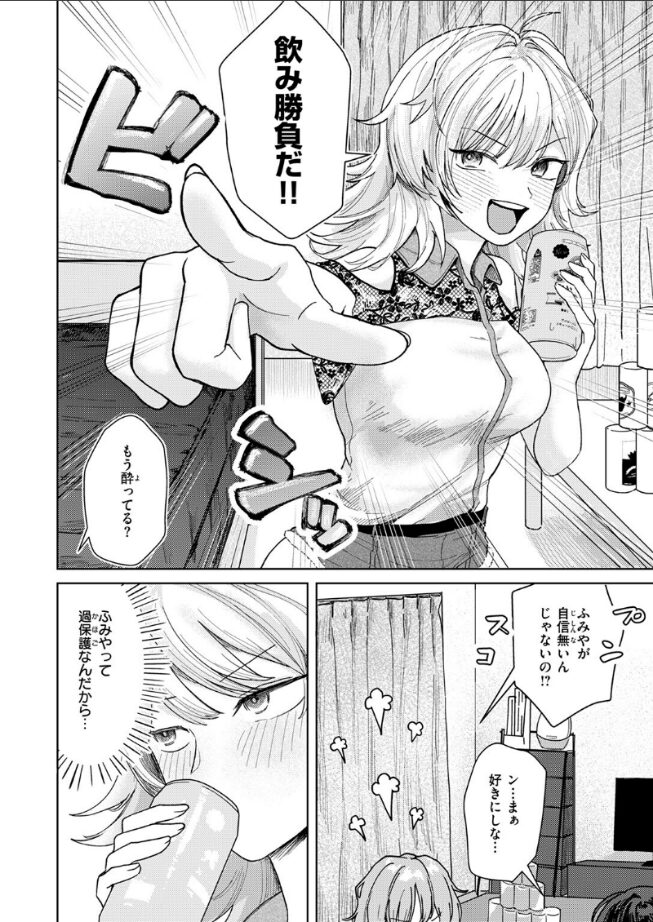 宅飲み中の女子大生であるいちかとその彼氏のふみやの物語であるが、この一見するとよく有り難ちな展開かと思いましたが、いちかの巨乳がもうたまらなかったので読みました。ページ数も26ページと少なめだったのであっという間に読み終えてしまいました。 いちかが寄ってトイレから帰ってくると床で乳を出して酩酊状態。この展開は正直読めなかったのでこの展開にワクワクしてしまいました。いちかをベッドに連れていくふみやだったが、いちかがムラムラしてきてふみやにキスをしていってそれからいちかが段々と大胆になっていってふみやにオナホしてもいいよと囁くところに興奮しました。 ふみやは酩酊状態で動けないいちかをバコンバコンと突いていちかをイカセて、さらには中出しをするという展開になっていきますが、この過程がもう興奮しまくりで面白くて一気読みしました。 |