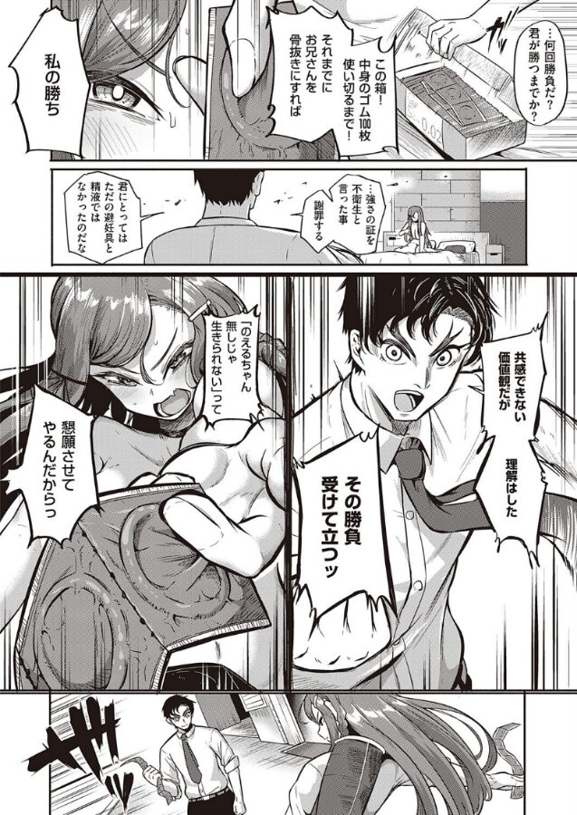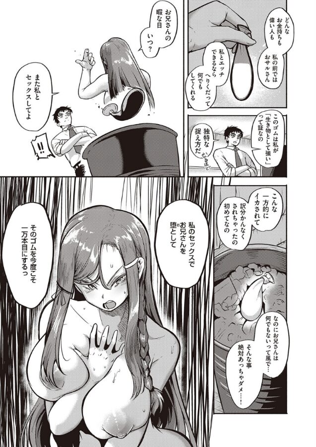 片手で男をイカせまくるビッチ系美少女JK・遊美のえるは、ついにあと一本で使用済みゴムが1万本に☆1万本目として街で見つけた真面目な童貞リーマンをサクッとヌいてあげる…つもりが、立てなくなるほど絶頂してしまう!!!!この結果が腑に落ちないのえるは、「ゴム100枚使い切るまでにお兄さんを骨抜きにする」と彼に勝負を挑む!!それからというもの、連日様々なプレイでセックス勝負するもイキまくってしまうのえる。一緒にいる時間が増えてきたある日、彼は突然「海外転勤が決まった」と告げてきて――。エロギャグの鬼才・かぱ先生贈る、1万本目のゴムを賭けて、男と女のガチンコ勝負(セックス)――!!