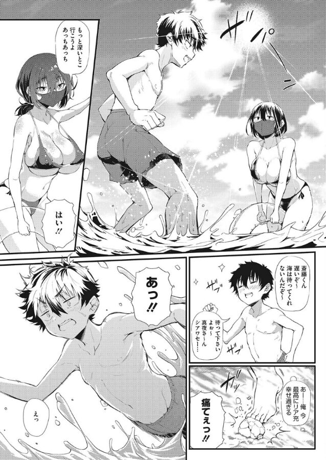 大人気に応えて、前回のヒロイン真夜さんが再登場! 斎藤君と海水浴デートを楽しむ彼女だったが、ふとしたことからマスクが外れて大赤面!! 岩場に隠れた二人は一安心…とばかりにお互いの体を求めあっていく。獣のように興奮した斎藤君のチ●ポは真夜さんの爆熱ボディーを攻略できるのか!?