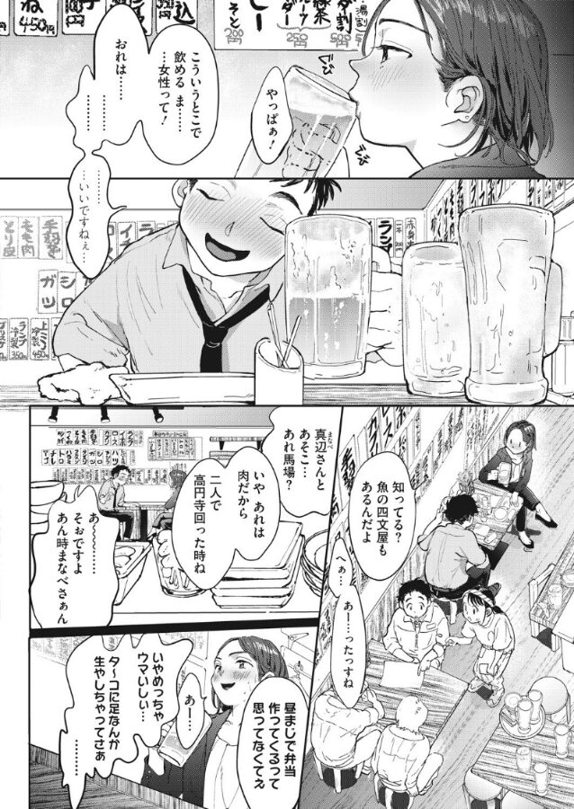 上司の真辺さんは飲みに付き合ってくれて、二人で営業廻りでも昼の弁当とかも作ってくれて…と酔ってお礼を言う戸田。何も気付いてないし、真辺さんの本音も知ろうとしない。終電逃して真辺さんのお家に向かって歩くのだが、真辺さんの躰は良い匂い。戸田は汗がいっぱい。ソファに倒れ込んだら、真辺さんのアソコはすごくその気だ。やっと伝わったのか、戸田は導かれるまま、飲み仲間から恋人に発展するのだ。